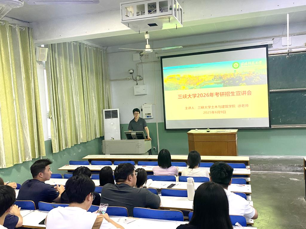 2025年6月9日,三峡大学土木与建筑公司研究生办公室主任徐潇宇来公司开展研究生招生宣讲活动。本次宣讲会在教2梯5教室举行,重点面向公司2022级本科生,公司副经理袁晓辉主持活动。