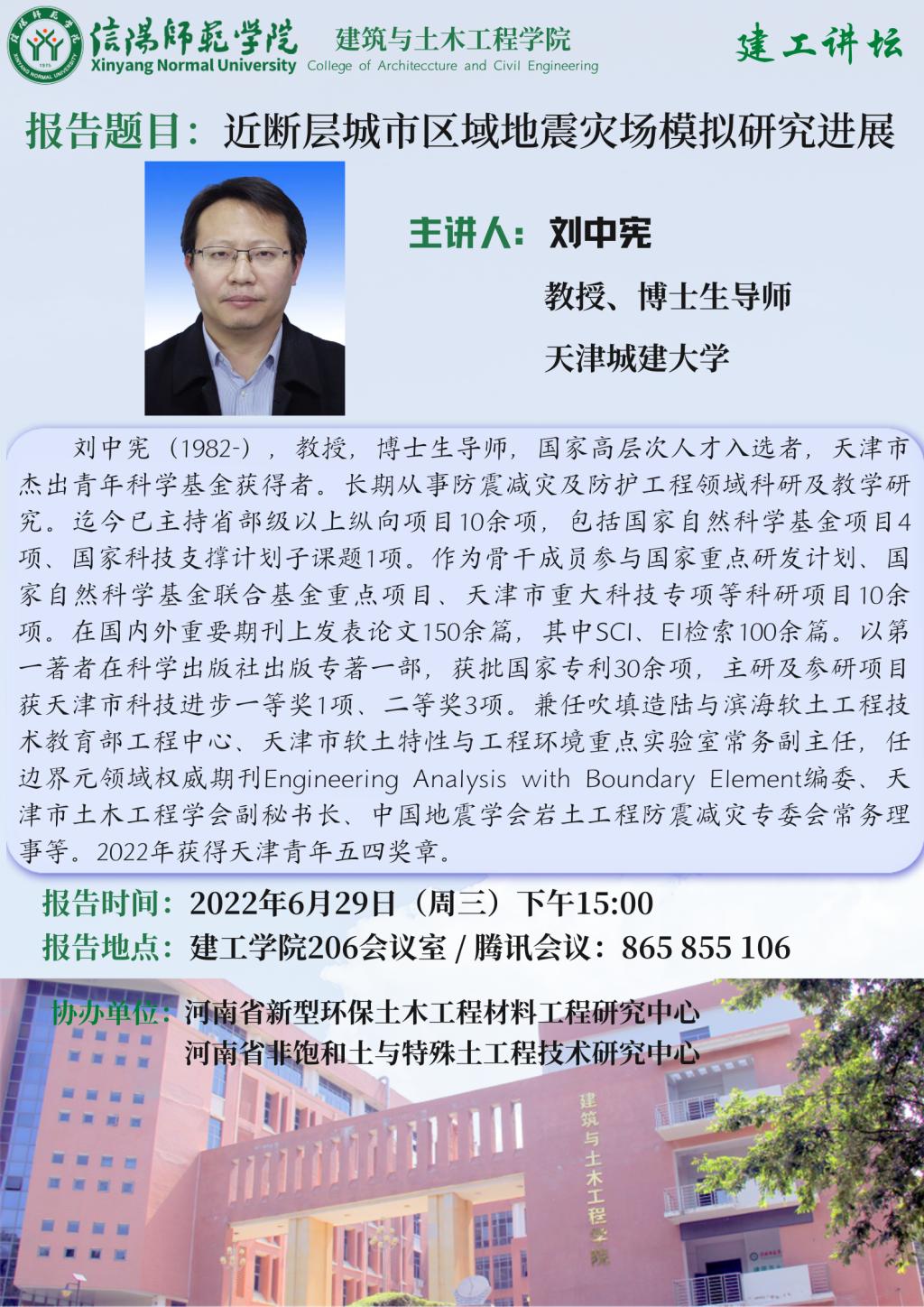 报告人简介:刘中宪(1982-),教授,博士生导师,国家高层次人才入选者,天津市杰出青年科学基金获得者。长期从事防震减灾及防护工程领域科研及教学研究。迄今已主持省部级以上纵向项目10余项,包括国家自然科学基金项目4项、国家科技支撑计划子课题1项。作为骨干成员参与国家重点研发计划、国家自然科学基金联合基金重点项目、天津市重大科技专项等科研项目10余项。在国内外重要期刊上发表论文150余篇,其中SCI、EI检索100余篇。以第一著者在科学出版社出版专著一部,获批国家专利30余项,主研及参研项目获天津市科技进步一等奖1项、二等奖3项。兼任吹填造陆与滨海软土工程技术教育部工程中心、天津市软土特性与工程环境重点实验室常务副主任,任边界元领域权威期刊Engineering Analysis with Boundary Element编委、天津市土木工程学会副秘书长、中国地震学会岩土工程防震减灾专委会常务理事等。2022年获得天津青年五四奖章。