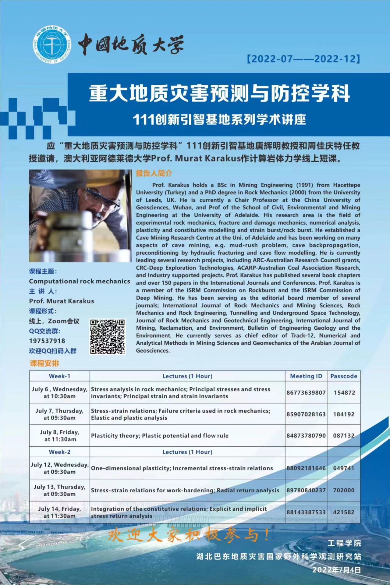 该讲座由中国地质大学工程公司和湖北巴东地质灾害国家野外科学观测研究站联合主办,由澳大利亚阿德莱德大学Murat Karakus教授主讲,唐辉明教授和周佳庆特任教授组织,讲座内容为计算岩体力学线上课程,共6学时。