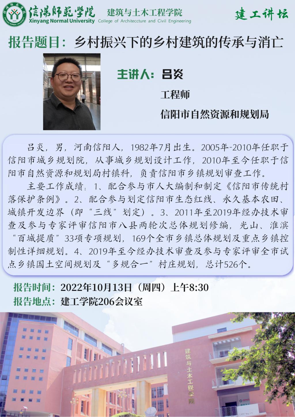 报告人简介:吕炎,男,河南信阳人,1982年7月出生。2005年-2010年任职于信阳市城乡规划院,从事城乡规划设计工作,2010年至今任职于信阳市自然资源和规划局村镇科,负责信阳市乡镇规划审查工作。主要工作成绩:1、配合参与市人大编制和制定《信阳市传统村落保护条例》。2、配合参与划定信阳市生态红线、永久基本农田、城镇开发边界(即“三线”划定)。3、2011年至2019年经办技术审查及参与专家评审信阳市八县两轮次总体规划修编,光山、淮滨“百城提质”33项专项规划,169个全市乡镇总体规划及重点乡镇控制性详细规划。4、2019年至今经办技术审查及参与专家评审全市试点乡镇国土空间规划及“多规合一”村庄规划,总计526个。