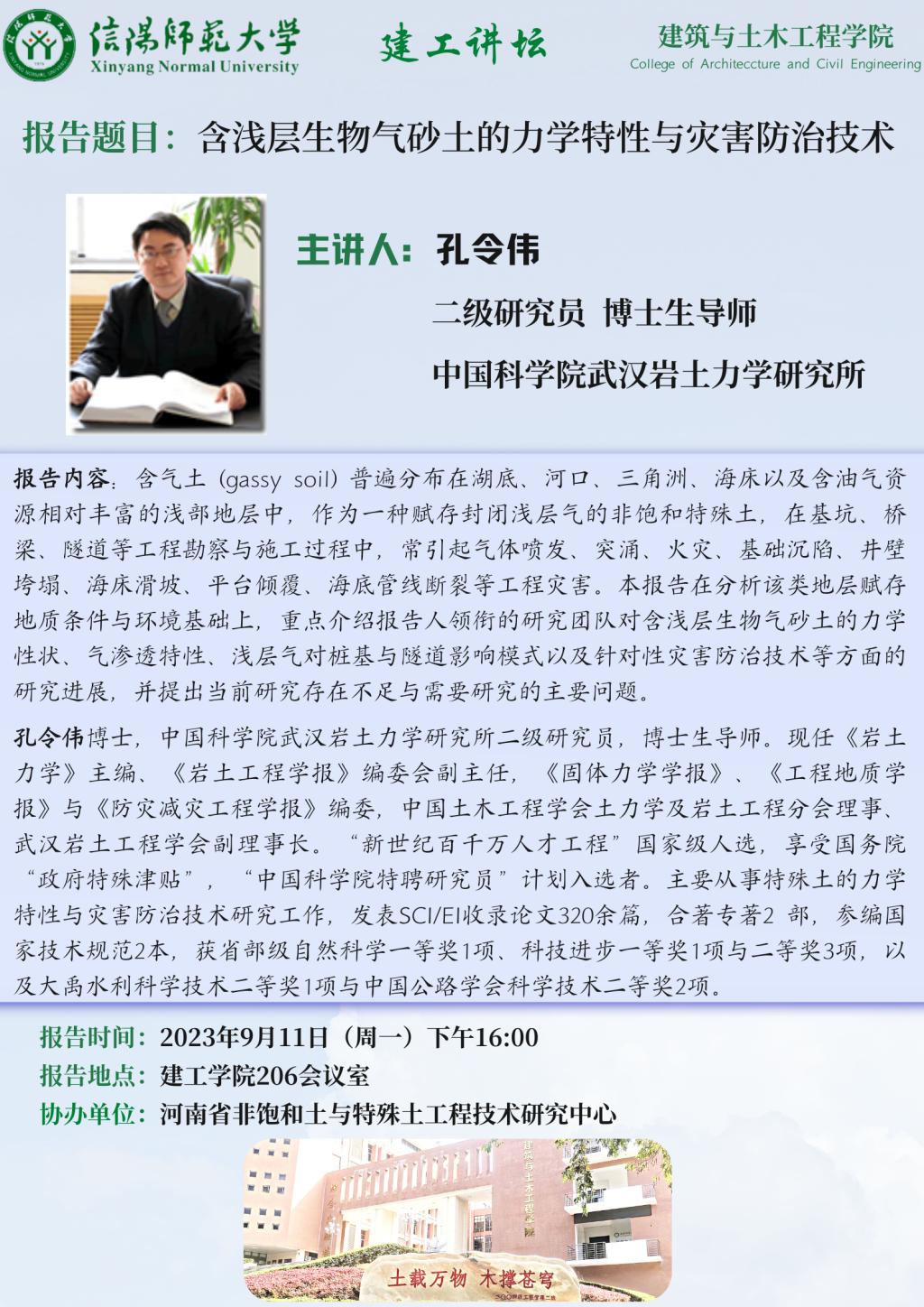 报告人简介:孔令伟博士,中国科公司武汉岩土力学研究所二级研究员,博士生导师。现任《岩土力学》主编、《岩土工程学报》编委会副主任,《固体力学学报》、《工程地质学报》与《防灾减灾工程学报》编委,中国土木工程学会土力学及岩土工程分会理事、武汉岩土工程学会副理事长。“新世纪百千万人才工程”国家级人选,享受国务院“政府特殊津贴”, “中国科公司特聘研究员”计划入选者。主要从事特殊土的力学特性与灾害防治技术研究工作,发表SCI/EI收录论文320余篇,合著专著2 部,参编国家技术规范2本,获省部级自然科学一等奖1项、科技进步一等奖1项与二等奖3项,以及大禹水利科学技术二等奖1项与中国公路学会科学技术二等奖2项。