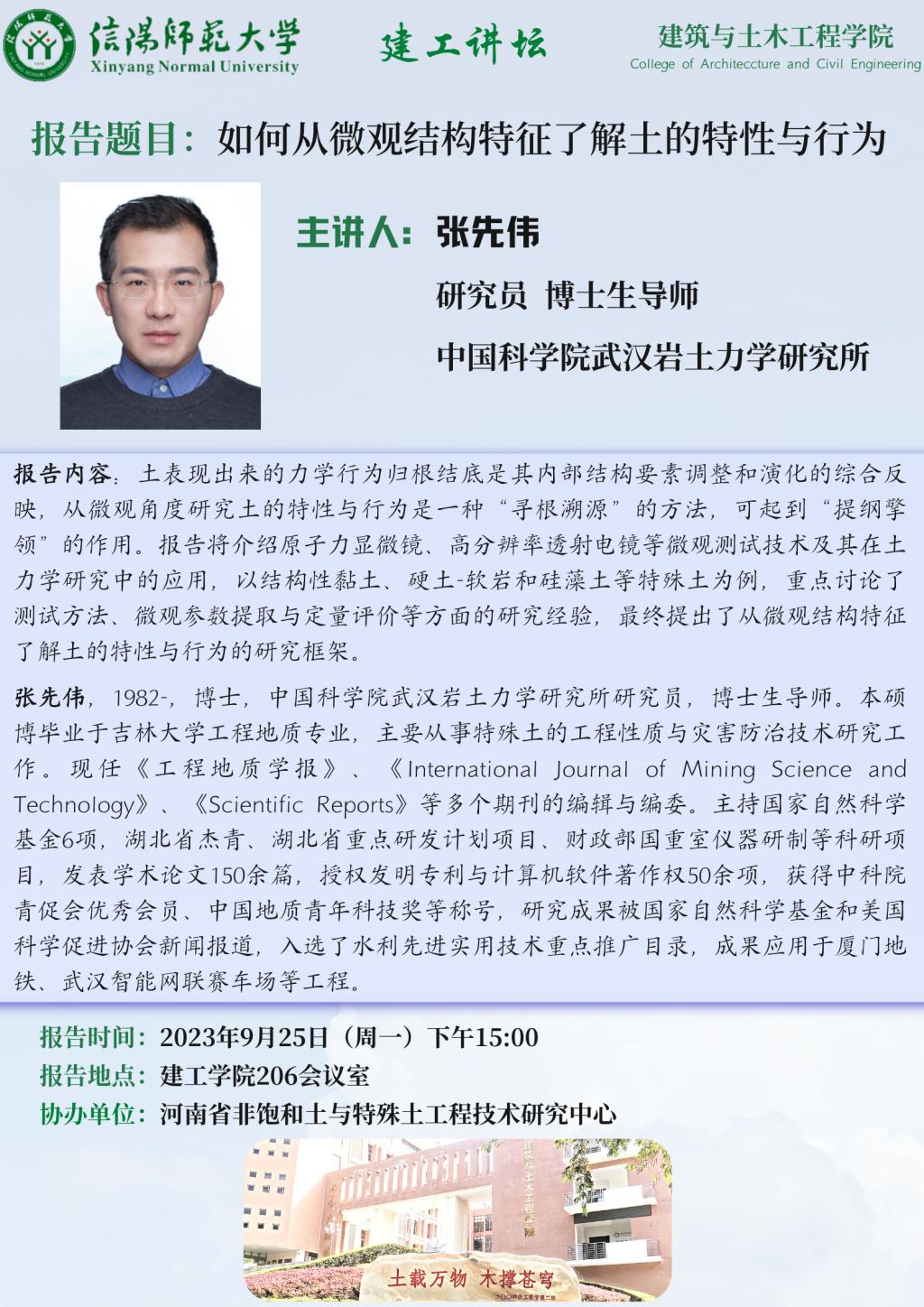 报告人简介:张先伟(1982-),博士,中国科公司武汉岩土力学研究所研究员,博士生导师。本硕博毕业于吉林大学工程地质专业,主要从事特殊土的工程性质与灾害防治技术研究工作。现任《工程地质学报》、《International Journal of Mining Science and Technology》、《Scientific Reports》等多个期刊的编辑与编委。主持国家自然科学基金6项,湖北省杰青、湖北省重点研发计划项目、财政部国重室仪器研制等科研项目,发表学术论文150余篇,授权发明专利与计算机软件著作权50余项,获得中国科公司青促会优秀会员、中国地质青年科技奖等称号,研究成果被国家自然科学基金和美国科学促进协会新闻报道,入选了水利先进实用技术重点推广目录,成果应用于厦门地铁、武汉智能网联赛车场等工程。