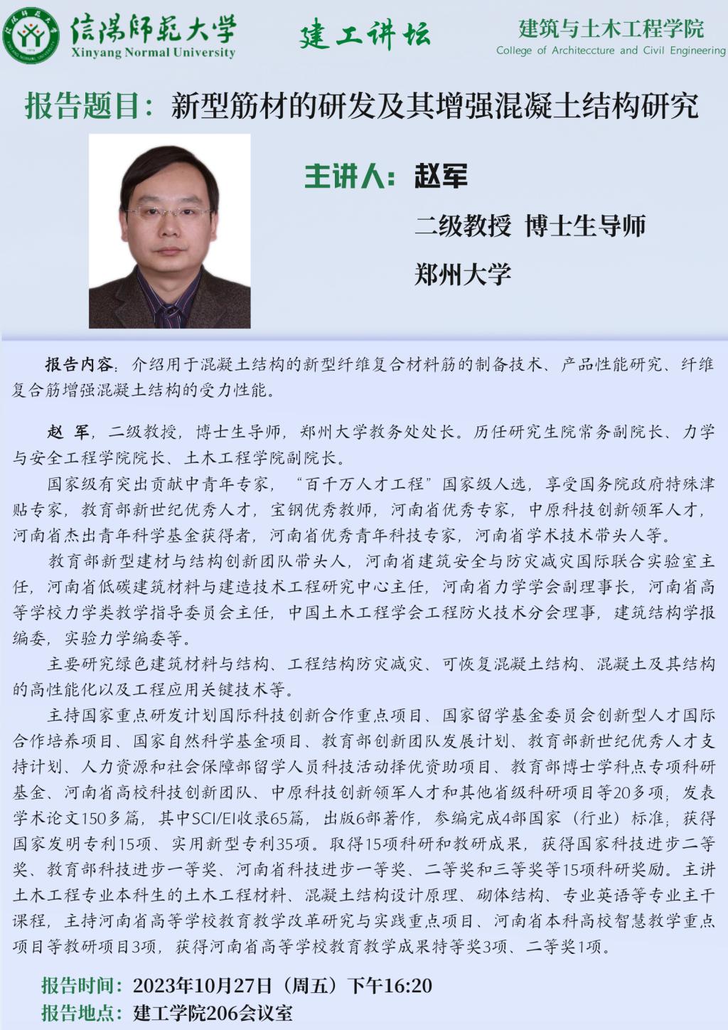 报告人简介:赵 军,二级教授,博士生导师,郑州大学教务处处长。历任研究生院常务副经理、力学与安全工程公司经理、土木工程公司副经理。国家级有突出贡献中青年专家,“百千万人才工程”国家级人选,享受国务院政府特殊津贴专家,教育部新世纪优秀人才,宝钢优秀教师,河南省优秀专家,中原科技创新领军人才,河南省杰出青年科学基金获得者,河南省优秀青年科技专家,河南省学术技术带头人等。教育部新型建材与结构创新团队带头人,河南省建筑安全与防灾减灾国际联合实验室主任,河南省低碳建筑材料与建造技术工程研究中心主任,河南省力学学会副理事长,河南省高等公司力学类教学指导委员会主任,中国土木工程学会工程防火技术分会理事,建筑结构学报编委,实验力学编委等。主要研究绿色建筑材料与结构、工程结构防灾减灾、可恢复混凝土结构、混凝土及其结构的高性能化以及工程应用关键技术等。主持国家重点研发计划国际科技创新合作重点项目、国家留学基金委员会创新型人才国际合作培养项目、国家自然科学基金项目、教育部创新团队发展计划、教育部新世纪优秀人才支持计划、人力资源和社会保障部留学人员科技活动择优资助项目、教育部博士学科点专项科研基金、河南省高校科技创新团队、中原科技创新领军人才和其他省级科研项目等20多项;发表学术论文150多篇,其中SCI/EI收录65篇,出版6部著作,参编完成4部国家(行业)标准;获得国家发明专利15项、实用新型专利35项。取得15项科研和教研成果,获得国家科技进步二等奖、教育部科技进步一等奖、河南省科技进步一等奖、二等奖和三等奖等15项科研奖励。主讲土木工程专业本科生的土木工程材料、混凝土结构设计原理、砌体结构、专业英语等专业主干课程,主持河南省高等公司公司产品改革研究与实践重点项目、河南省本科高校智慧教学重点项目等教研项目3项,获得河南省高等公司公司产品成果特等奖3项、二等奖1项。