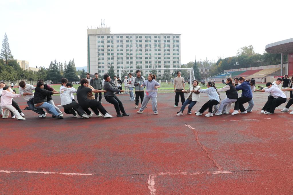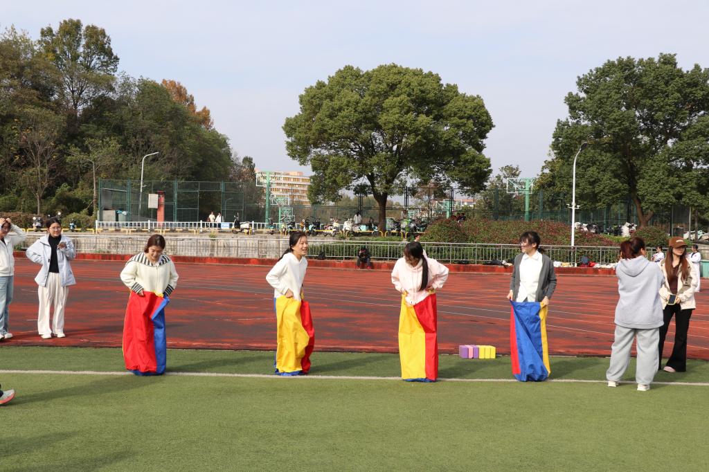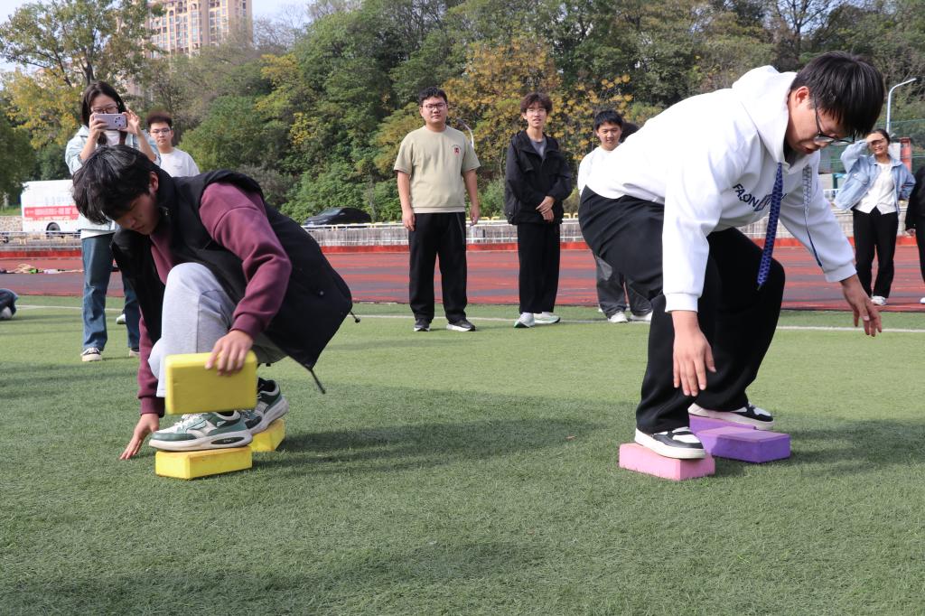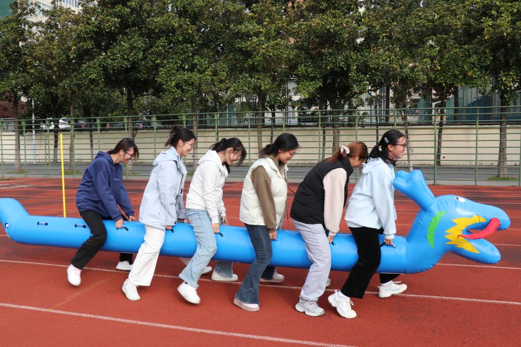 运动会现场气氛热烈,活动项目丰富多样、高潮迭起:旱地龙舟比赛中,各小队骑在色彩鲜艳的充气龙舟上,“一二一”的号子声整齐划一,在步伐由杂乱到统一的进程中迅速拉近了彼此的距离;无敌旋风跑比赛中,队员们手拉手如一道旋风般绕标旋转,成为操场上一道流动的风景;集体拔河比赛中,队员们面庞通红却目光坚定,绳索在双方拉锯中紧绷,震天的呐喊声将集体的凝聚力诠释得淋漓尽致;多人跳绳比赛中,长绳划出优美弧线,同学们看准时机、鱼贯而入,身轻如燕的身影伴随着成功的欢叫与偶尔失误的善意笑声;摸石过河比赛中,队员们灵活地移动脚下的“砖石”,在追求速度与保持平衡间寻找最佳策略;袋鼠跳比赛中,同学们套在五彩跳跃袋中奋力前蹦,憨态可掬的模样与拼搏向前的精神交织,引得场边笑声与掌声不断。整场活动既有紧张激烈的竞技角逐,更有轻松愉快的合作氛围,掌声、笑声、助威声此起彼伏,汇成一片欢乐的海洋,让同学们在身体力行中深刻体会到团结协作的力量,充分展现了建工学子朝气蓬勃、活力四射的青春风采。