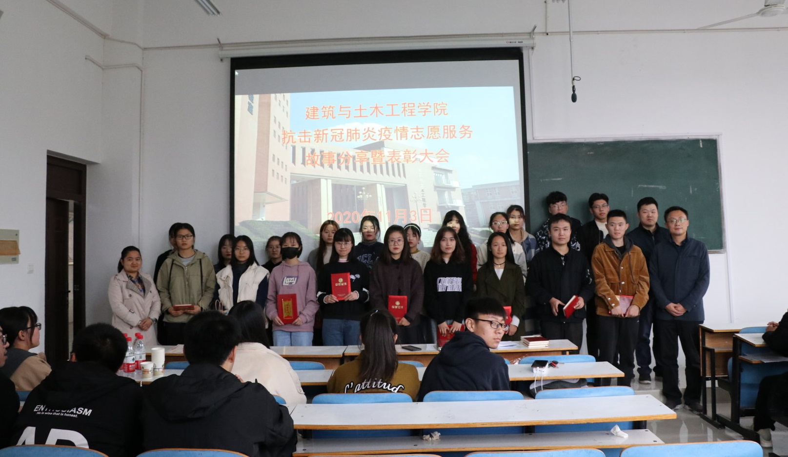 会上,对参加抗击疫情志愿服务的同学们和以“致敬 感恩 前行”为主题征集的抗疫优秀作品的作者们进行了表彰。