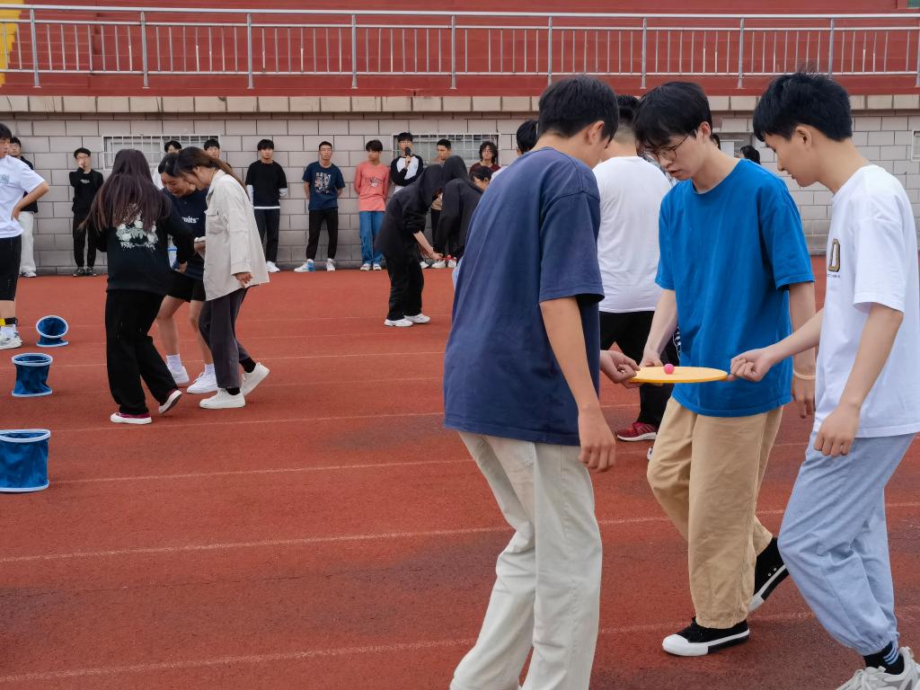 参赛同学以13人为一组,共8个小组相互比拼,同台竞技,共有摸石过河、十指连心、珠行万里和巨人脚步四个项目。在摸石过河中,同学们三块砖交替踩着往前走,刚开始手忙脚乱,但大家沉着冷静,慢慢摸索到了技巧,开始稳步前进;在十指连心中,三位同学摇摇晃晃,保持着盘子的平衡,避免小球滚下;在珠行万里中,同学们行动配合默契,衔接精密,有序地用球槽将小球滚动至目的地;在巨人脚步中,大家喊着121的响亮口号,调整团队的节奏和步伐,逐渐加速到达终点。操场上,呐喊声此起彼伏,同学们在运动和欢笑中团结一心、释放自我、拼搏全力,脸上洋溢着欢乐的笑容。