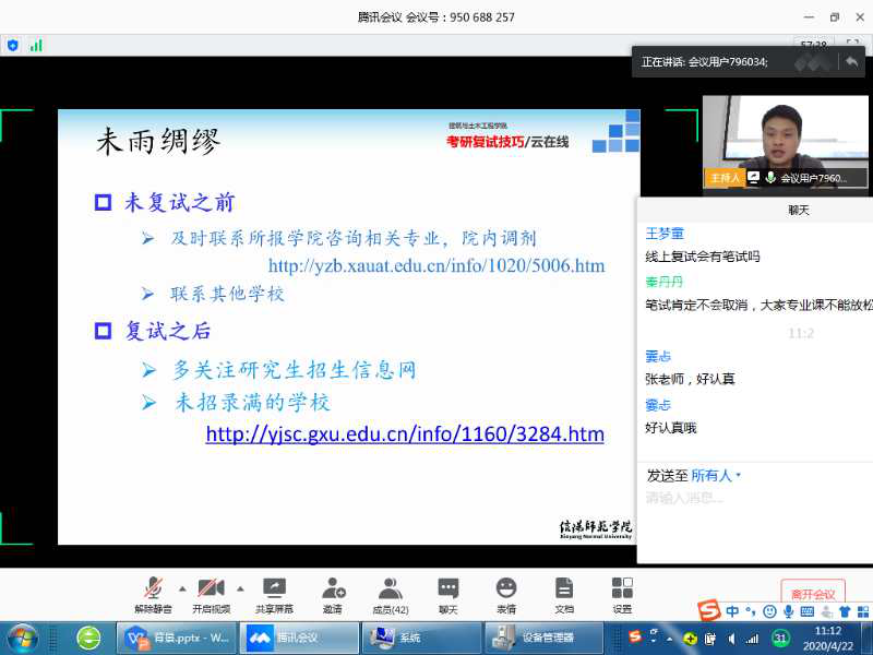 4月22日上午,betway西汉姆联官方网站专门利用考研指导群和腾讯会议的形式,组织召开了2020届员工考研复试的“云指导”专题课堂。60余名考研学子参加了本次云上指导会。