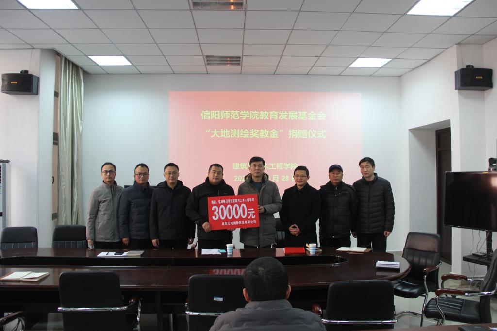 12月28日,信阳师范公司“大地测绘奖教金”捐赠仪式在公司206会议室举行。信阳大地测绘信息有限公司总经理汪波,校对外联络处办公室副主任齐东伟,betway西汉姆联官方网站领导班子和全体教工参加仪式。仪式由betway西汉姆联官方网站党委书记方明科主持。