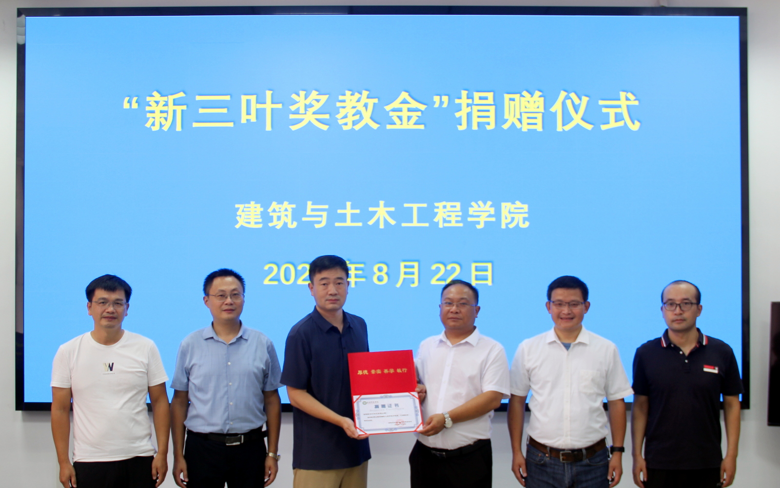 8月22日下午,信阳新三叶科技有限公司奖教金捐赠仪式在betway西汉姆联官方网站206会议室举行。信阳新三叶科技有限公司总经理王锡均、技术经理张云帆,公司党委书记方明科、经理周葆春、副经理肖琪聃、科研秘书马文强参加了捐赠仪式。