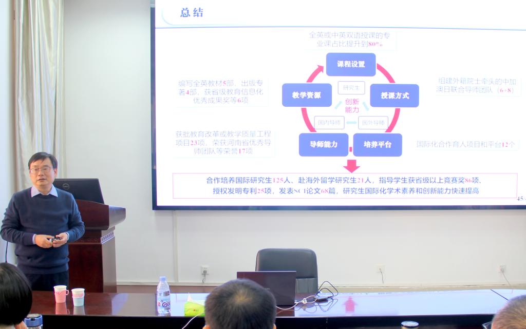 报告会上,赵军教授介绍了河南省研究生高等公司产品成果特等奖“五维融合双向驱动:工科专业卓越研究生国际化培养体系创新与实践”的主要成果:为积极响应习近平总书记提出的“构建人类命运共同体”理念,对接国家“加快培养具有全球视野的高层次国际化人才”需求,落实《河南省“十四五”教育事业发展规划》有关“提高国际化创新型人才培养能力,教育对外开放水平显著提升”发展任务,在国家重点研发计划国际合作重点项目、国家留学基金委人才培养合作项目、国家社会科学基金、河南省教学改革重点项目等29个项目支撑下,依托12个国际化合作育人项目与平台,构建“五维融合 双向驱动”的卓越研究生国际化人才培养体系,实现中外文化交融的国际化育人资源、育人空间、育人模式,为新常态下培养具有国际视野和全球胜任力的高层次创新型人才提供了有价值的行动方案。